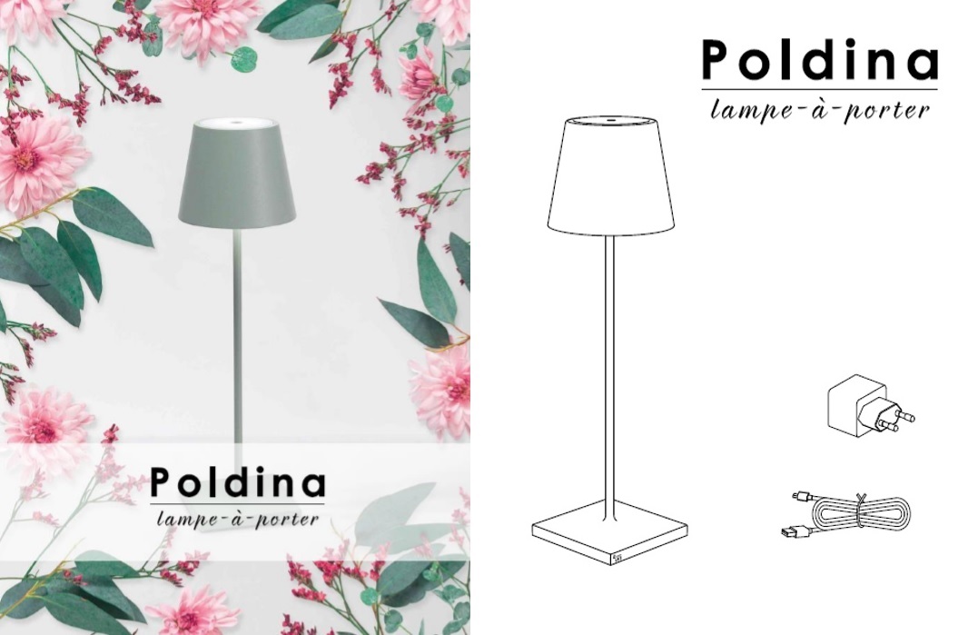 Wiederaufladbare und dimmbare Tischlampe aus Aluminium, matt lackiert, mit einer LED-Lichtquelle und einem Diffusor aus Polycarbonat. Die Leuchten der Kollektion Poldina haben den Schutzgrad IP54 und eignen sich sowohl für den Einsatz im Innen- wie auch im Aussenbereich.
