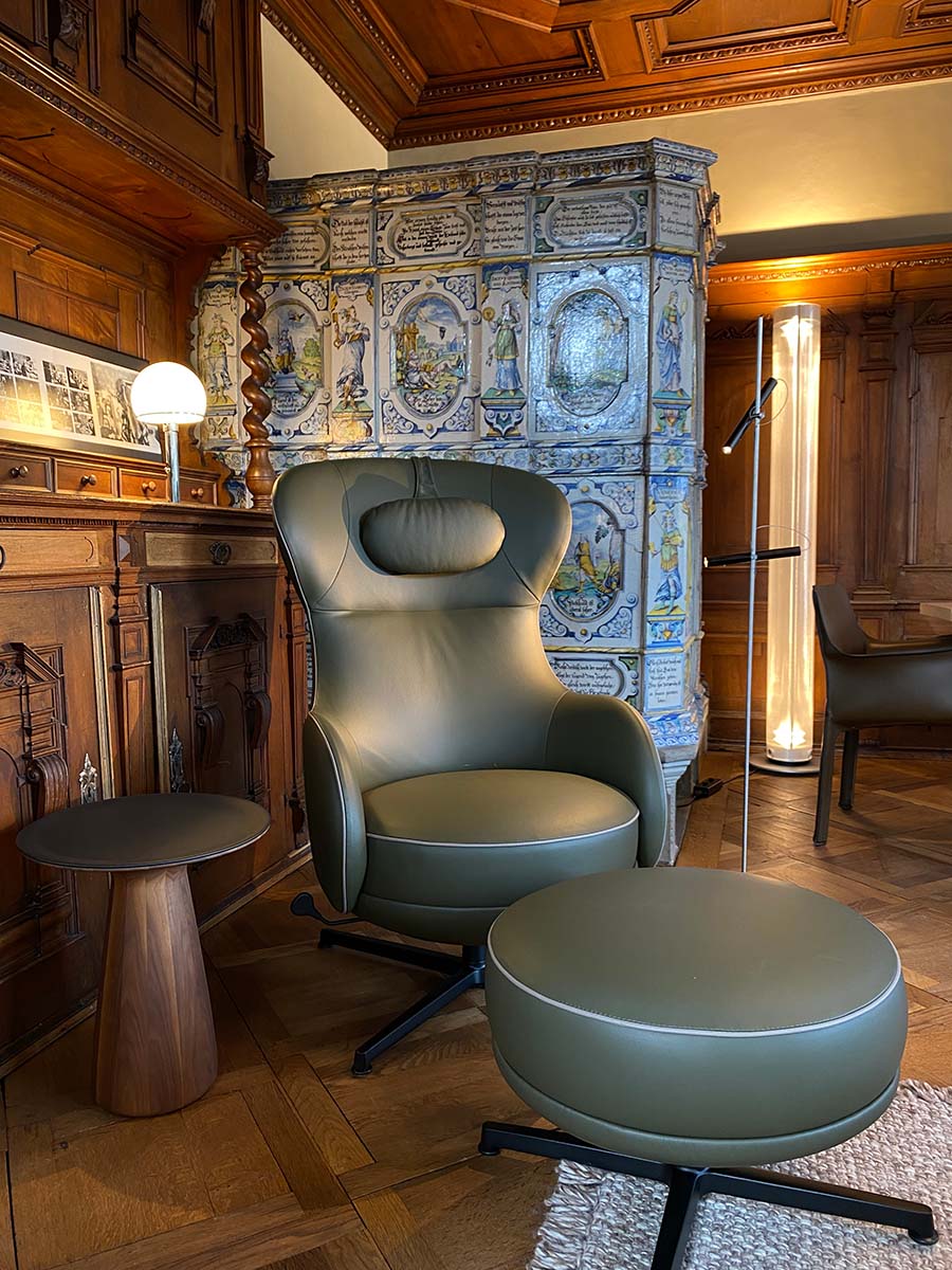 Geschmeidige Kommunikation ist auch die Stärke von Hayons neuem Modell für Wittmann. Seine wohlproportionierte Sitzschale in klassischer Ohrensesselform wippt gemütlich, ist 360° drehbar und lässt sich ganz nach Lust und Laune stufenlos in jeder beliebigen Lehnposition arretieren. Wer sehnt sich nicht nach dieser autonomen Art des Relaxens? Und zwar solo, auf einem Möbelstück, das man ganz allein okkupiert und selbstbestimmt nützt. Füße auf den dazugehörenden Hocker und entspannen.