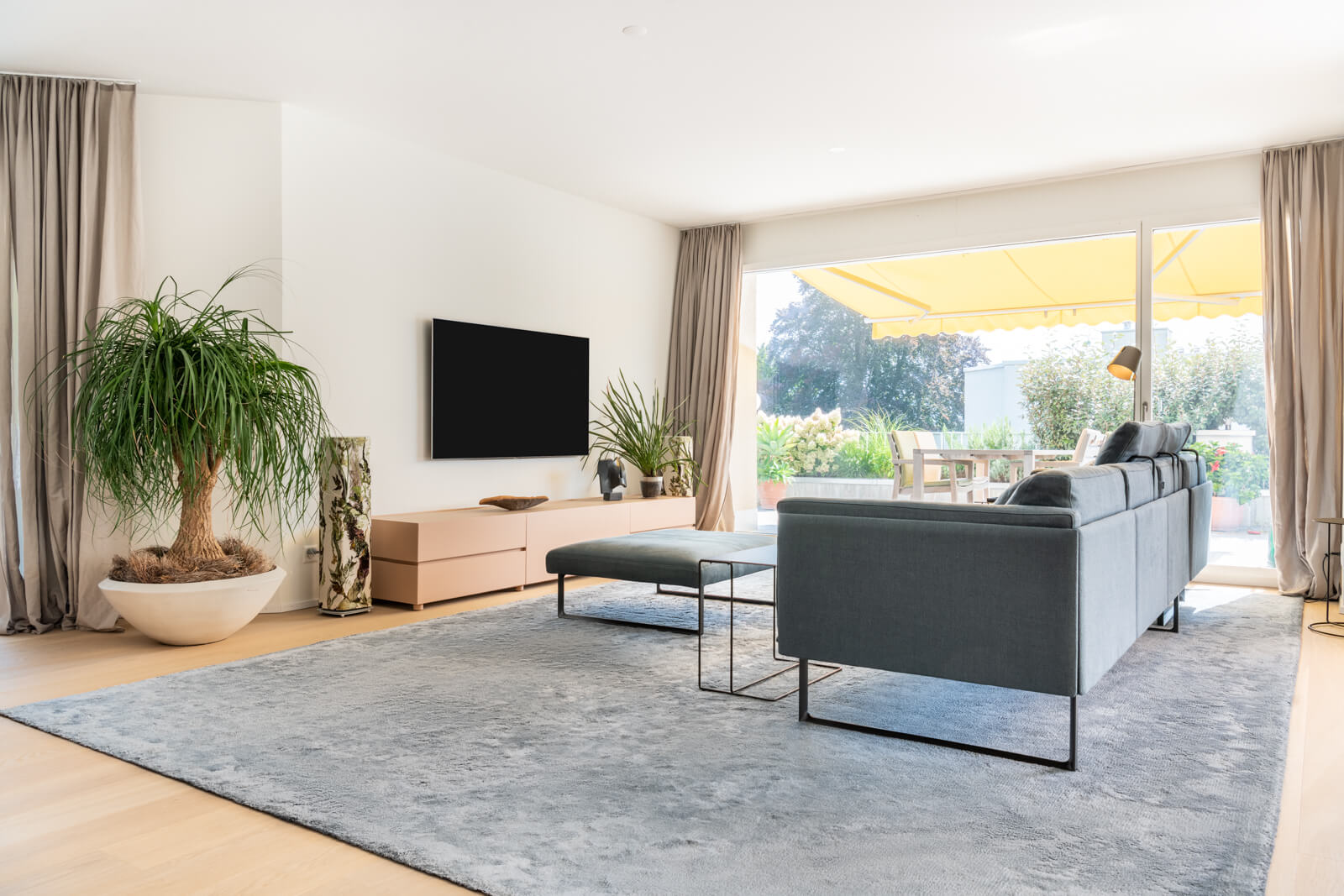Hochwertige Teppiche und massgeschneiderte Vorhänge ergänzen das Interieur und sorgen für Wärme sowie Struktur. Jeder Raum erhielt eine eigene, klar definierte Atmosphäre. Zum Abschluss wurde das Konzept mit ausgewählten Accessoires verfeinert. Diese Details verleihen der Wohnung Persönlichkeit und Ausdruck. So entstand ein exklusives Zuhause mit zeitloser Ausstrahlung und hohem Wohnkomfort.